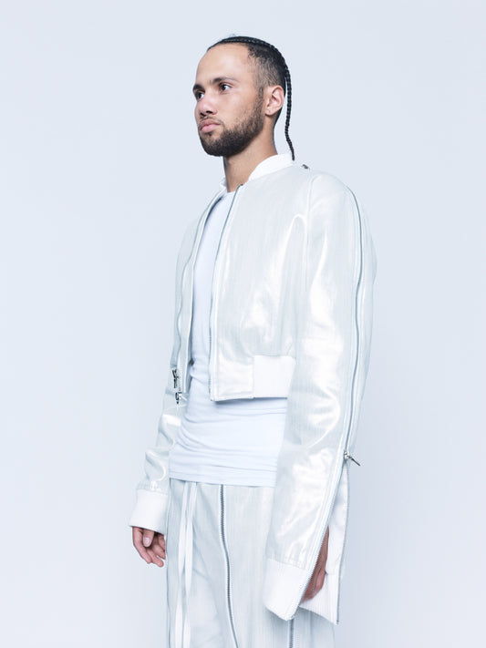 966 White Silver Coated Denim Zipper Bomber Unisex